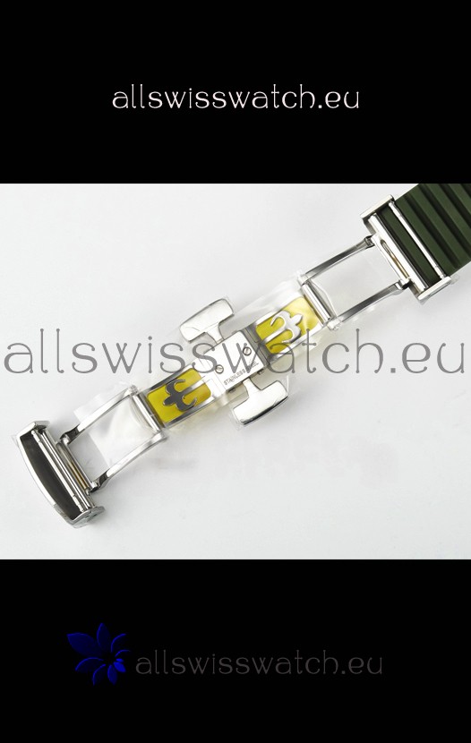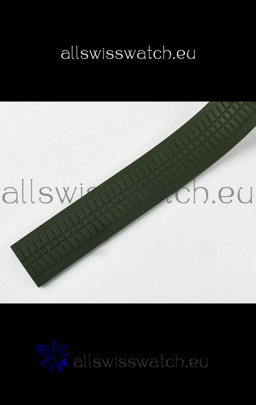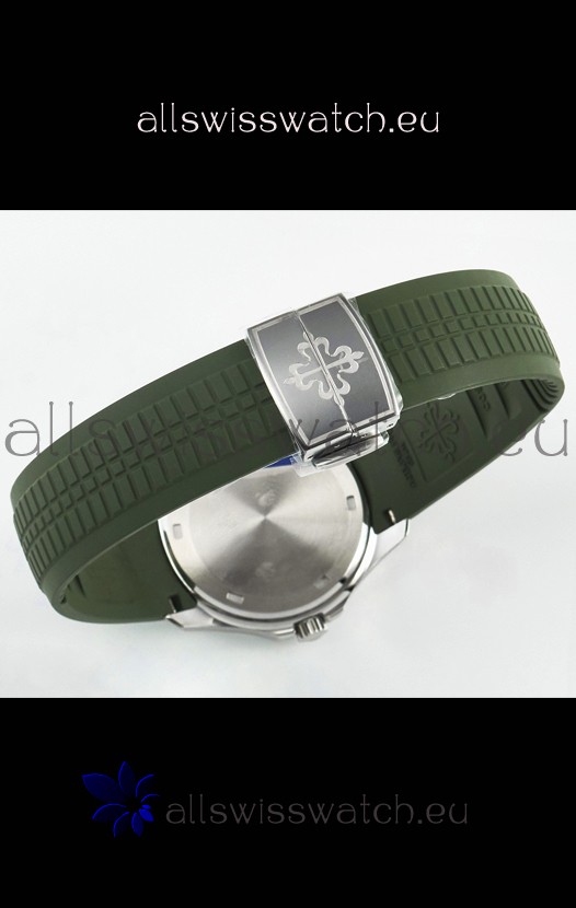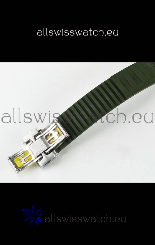 Green Curved Rubber Strap with Steel Folding Clasp complete with Patek Philippe Markings. A Highly Updated Clasps for this series with much more accurate markings/engravings.