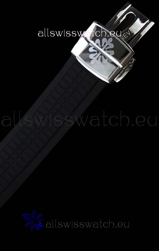 Genuine Black Rubber Strap complete with Patek Philippe Markings and Engravings complete with Patek Philippe Signature Folding Clasps as per the genuine