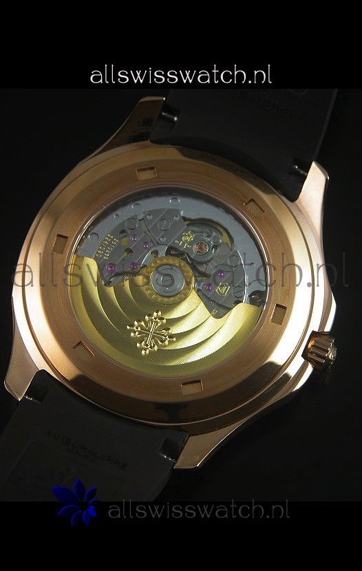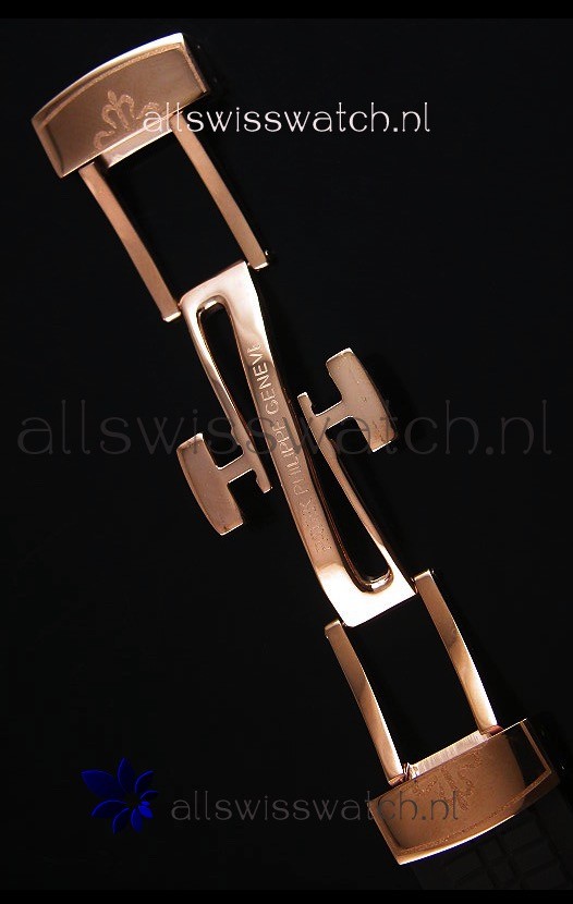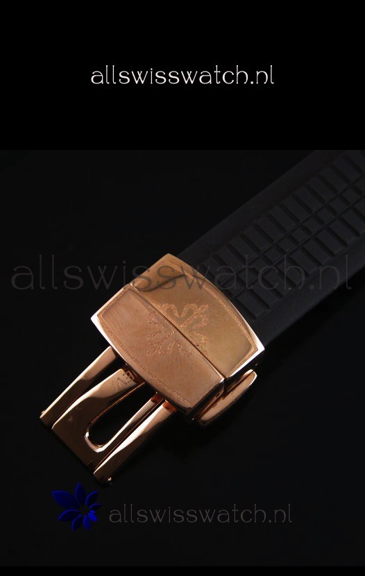 Black Rubber Strap with Rose Gold Folding Clasp complete with Patek Philippe Markings.