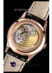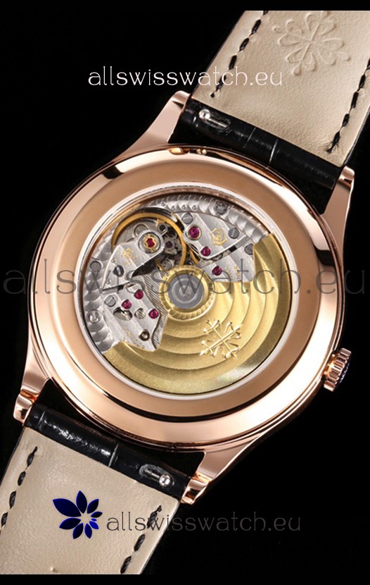 Genuine Swiss 9015 Movement assembled to Resemble the Authentic Patek Philippe PP 324 Calibre Style Movement. Updated Rotor, Bridged and Engravings on Movement with Rose Gold Plated Patek Philippe Stamped Rotor