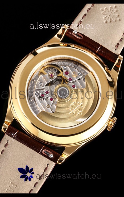 Genuine Swiss 9015 Movement assembled to Resemble the Authentic Patek Philippe PP 324 Calibre Style Movement. Updated Rotor, Bridged and Engravings on Movement with Rose Gold Plated Patek Philippe Stamped Rotor