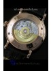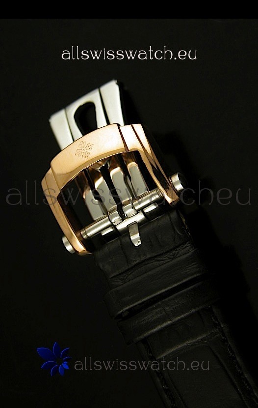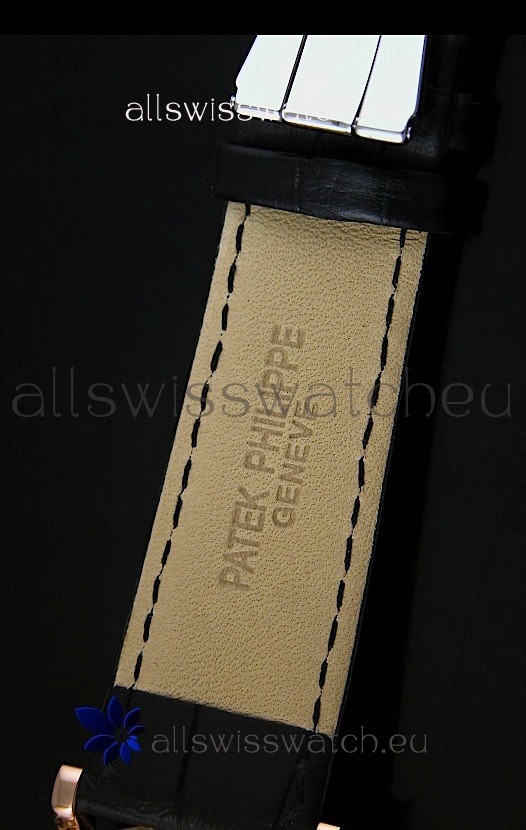 Genuine Leather Strap with Patek Philippe Markings and Engravings and Pink Gold Plated Buckle