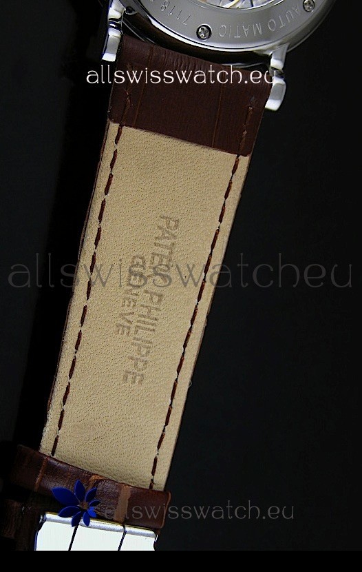 Genuine Leather Strap with Patek Philippe Markings and Engravings and Pink Gold Plated Buckle