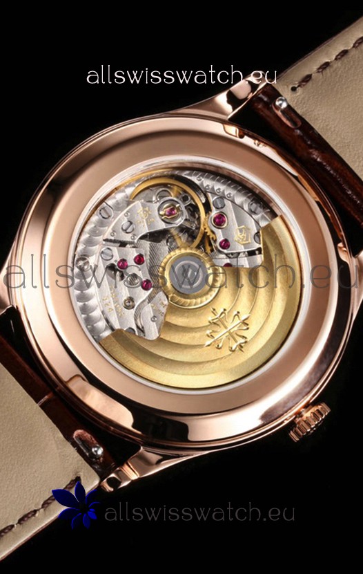 Genuine Swiss 9015 Movement assembled to Resemble the Authentic Patek Philippe PP 324 Calibre Style Movement. Updated Rotor, Bridged and Engravings on Movement with Rose Gold Plated Patek Philippe Stamped Rotor
