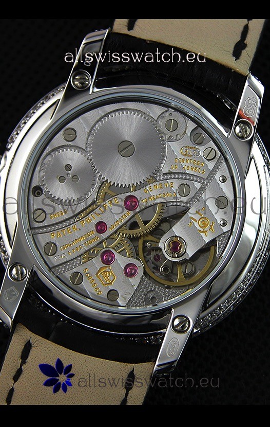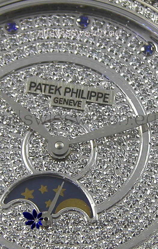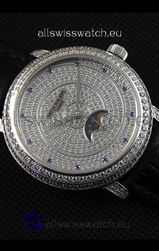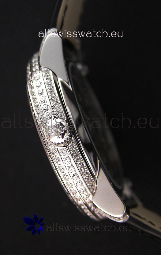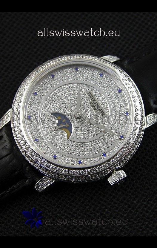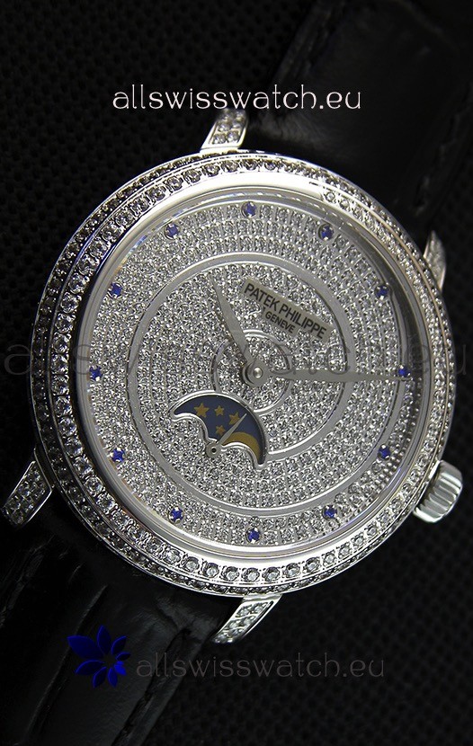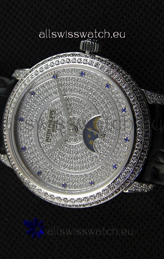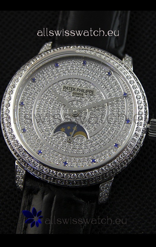 Diamonds Encrusted Dial with MoonPhase Indicator (MoonPhase is a Night/Day Indicator and not the Actual MoonPhase found in Original Patek Philippe 4968 Watches)