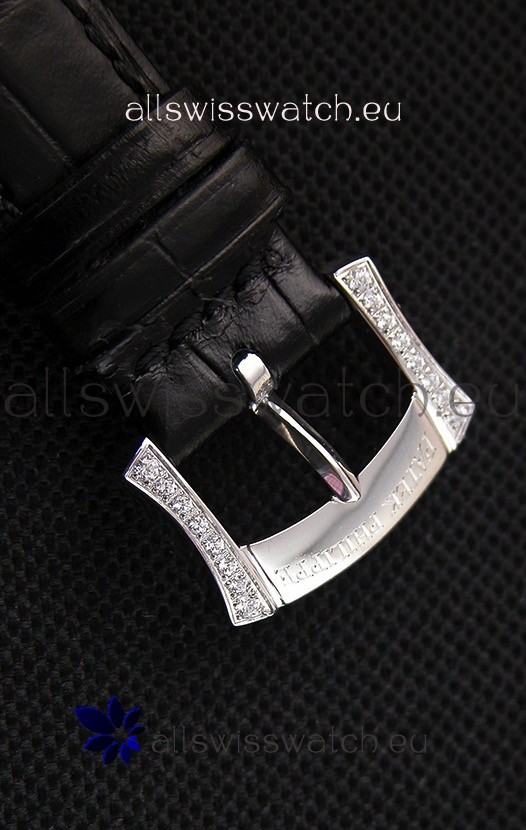 Genuine Leather Strap with Diamonds Encrusted Steel Tang Buckle complete with Patek Philippe Markings.