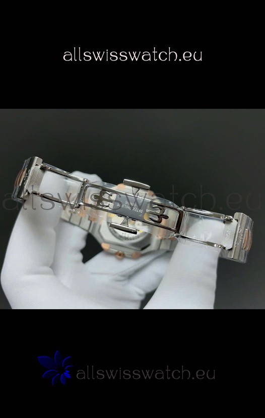 18K Rose Gold Two Tone Plating on 904L Solid Stainless Steel Case with Open Case Back Cover in Steel. Polished Bezel Borders