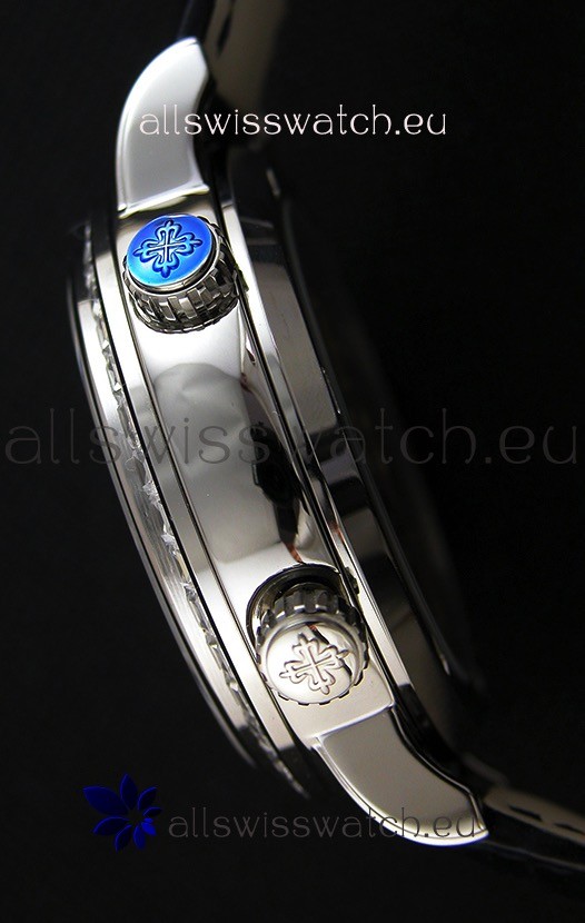 Date is Adjusted through the Crown at 2 O'Clock, MoonPhase is adjust via the crown at 4 O'Clock (MoonPhase is a Night/Day Indicator and not the Actual MoonPhase found in Original Patek Philippe 6120P Watches)