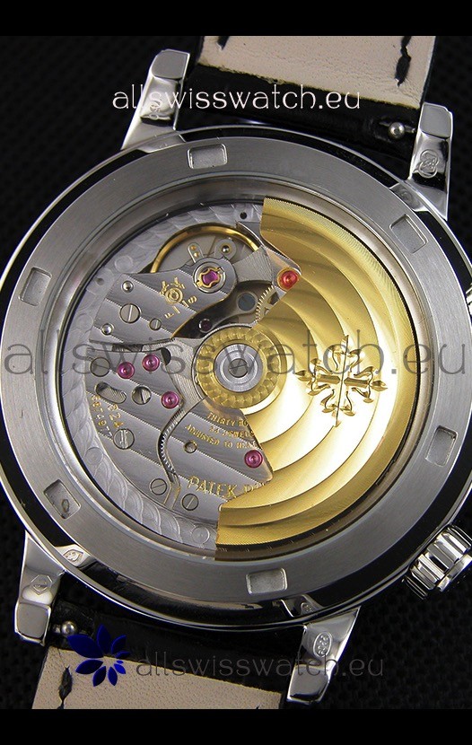 Genuine Swiss 9015 Movement assembled to Resemble the Authentic Patek Philippe PP 240 Calibre Style Movement. Updated Rotor, Bridged and Engravings on Movement with Rose Gold Plated Patek Philippe Stamped Rotor