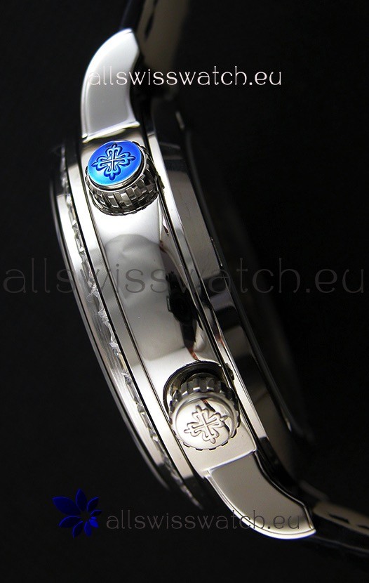 Date is Adjusted through the Crown at 2 O'Clock, MoonPhase is adjust via the crown at 4 O'Clock (MoonPhase is a Night/Day Indicator and not the Actual MoonPhase found in Original Patek Philippe 6120P Watches)