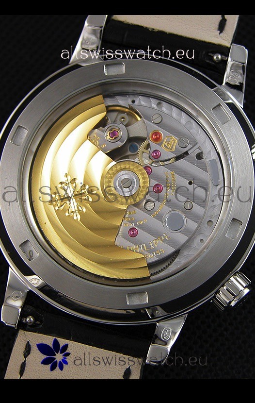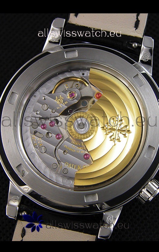 Genuine Swiss 9015 Movement assembled to Resemble the Authentic Patek Philippe PP 240 Calibre Style Movement. Updated Rotor, Bridged and Engravings on Movement with Rose Gold Plated Patek Philippe Stamped Rotor
