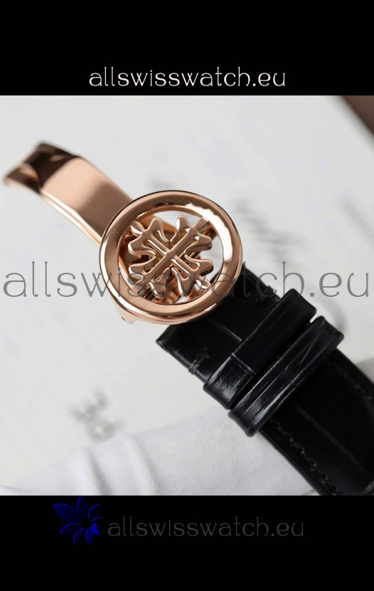 Genuine Leather Strap with Rose Gold Plated Folding Clasp complete with Patek Philippe Markings.
