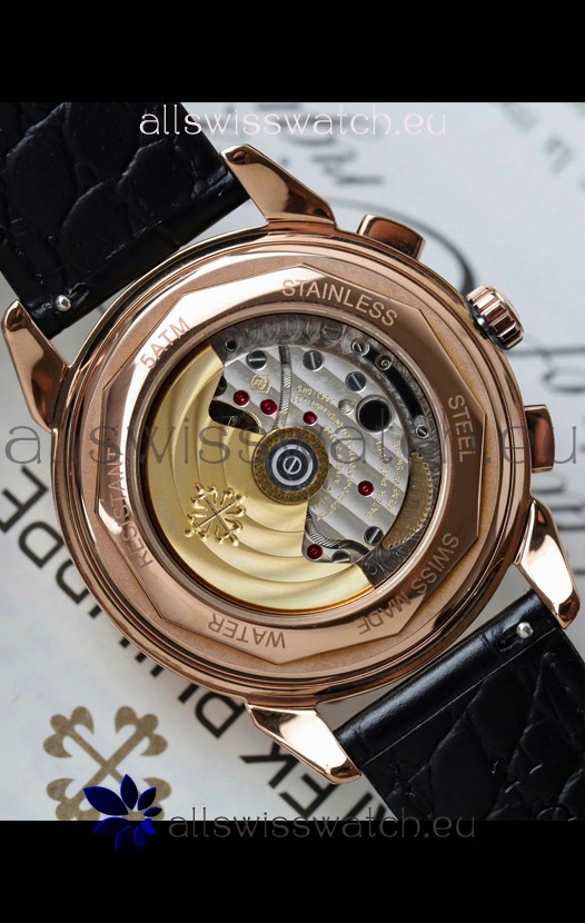 Genuine Swiss 9015 Movement assembled to Resemble the Authentic Patek Philippe PP 324 Calibre Style Movement. Updated Rotor, Bridged and Engravings on Movement with Rose Gold Plated Patek Philippe Stamped Rotor