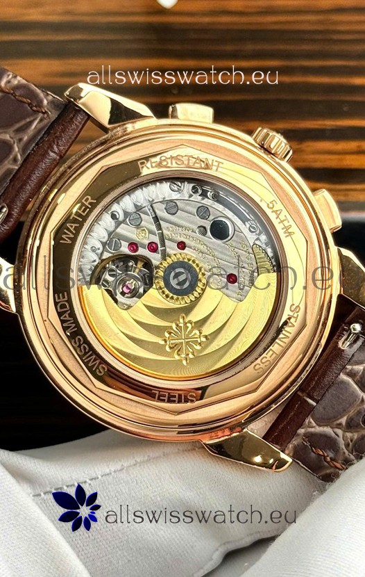 Genuine Swiss 9015 Movement assembled to Resemble the Authentic Patek Philippe PP 324 Calibre Style Movement. Updated Rotor, Bridged and Engravings on Movement with Rose Gold Plated Patek Philippe Stamped Rotor
