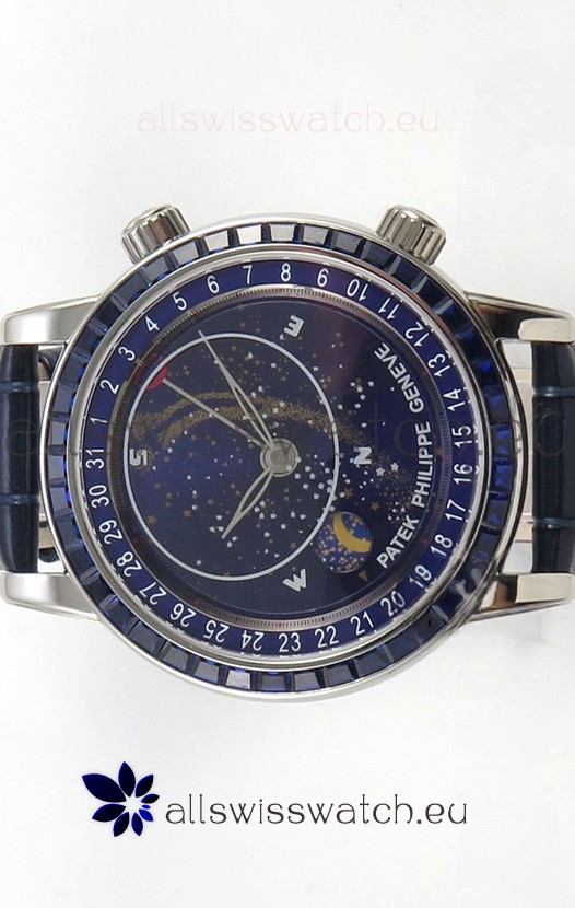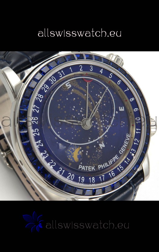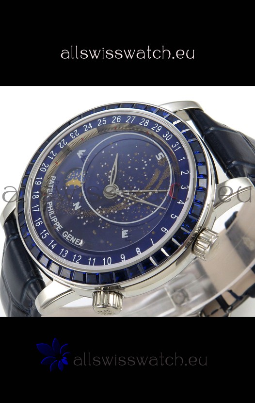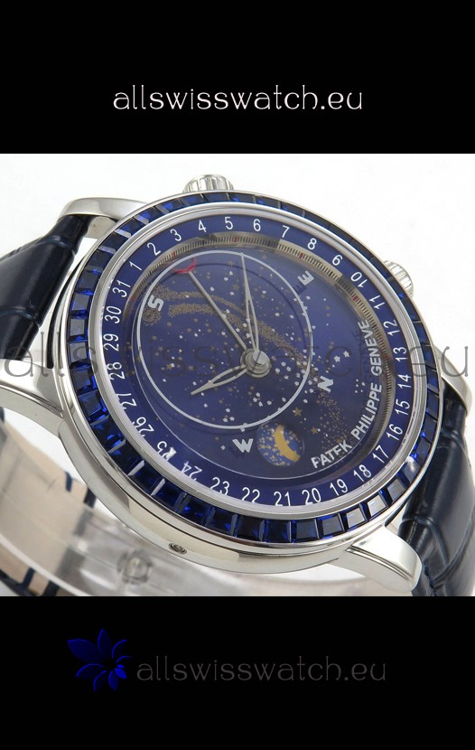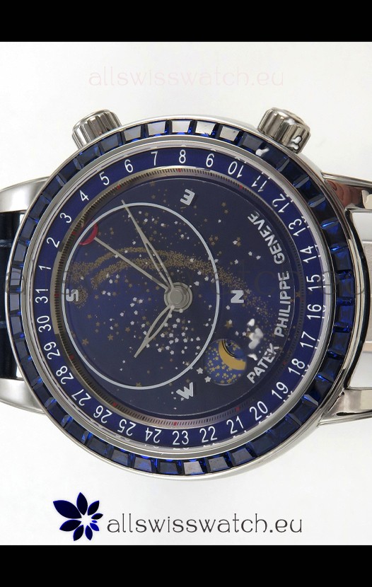 Blue Sky Moon Celestial Dial with Date Numerals around the Dial. Sapphires Bezel