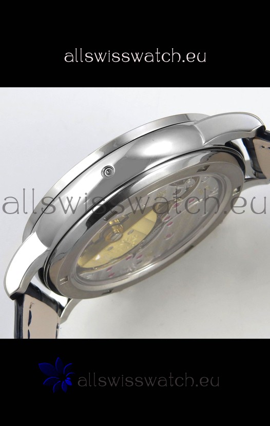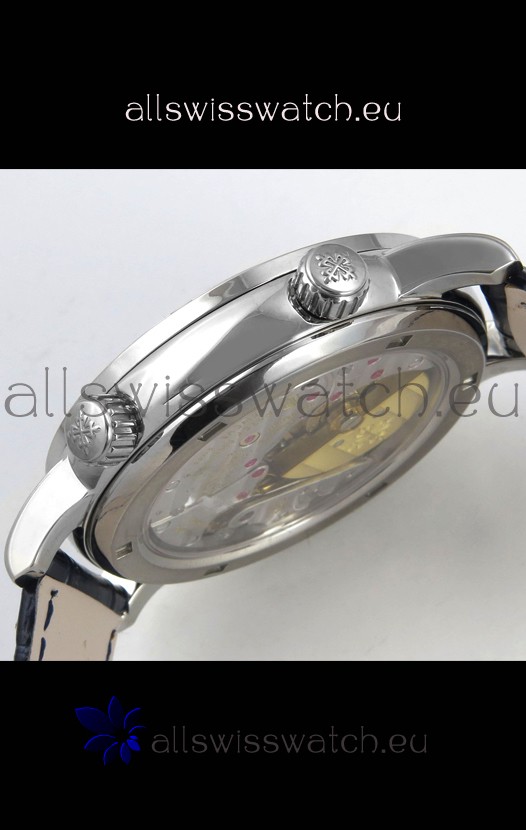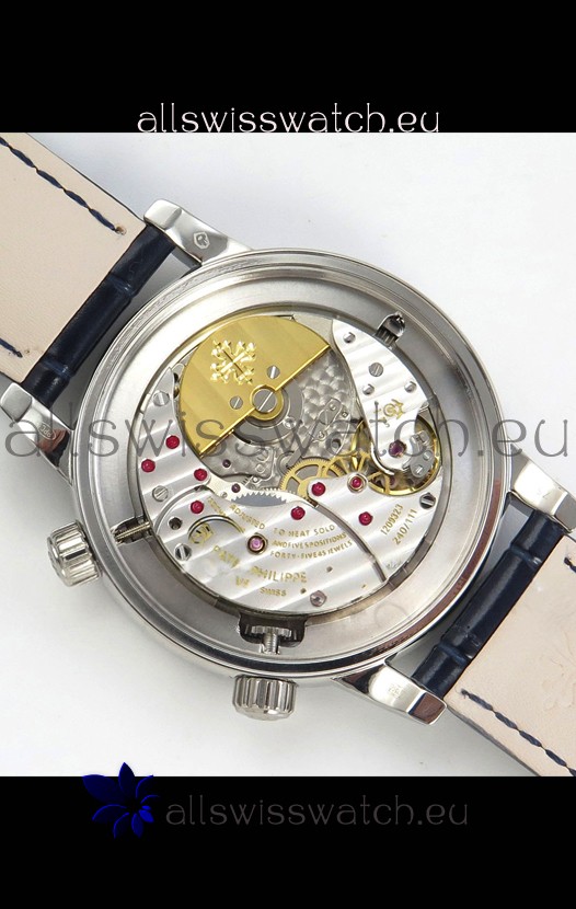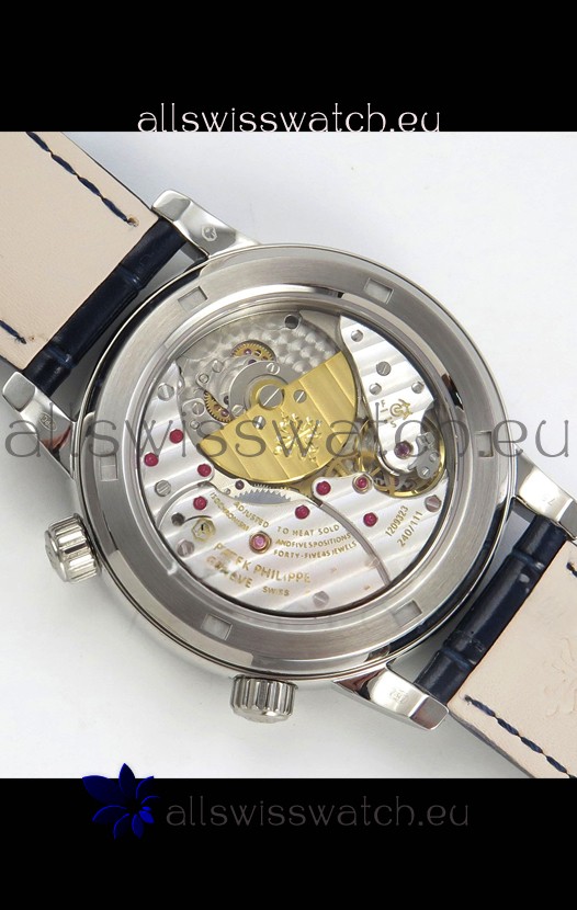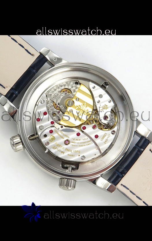 Genuine Swiss 9015 Movement assembled to Resemble the Authentic Patek Philippe PP 240 Calibre Style Movement. Updated Rotor, Bridged and Engravings on Movement with Rose Gold Plated Patek Philippe Stamped Rotor