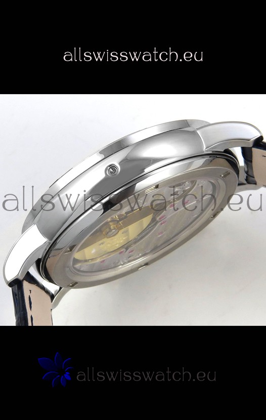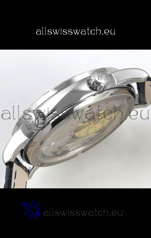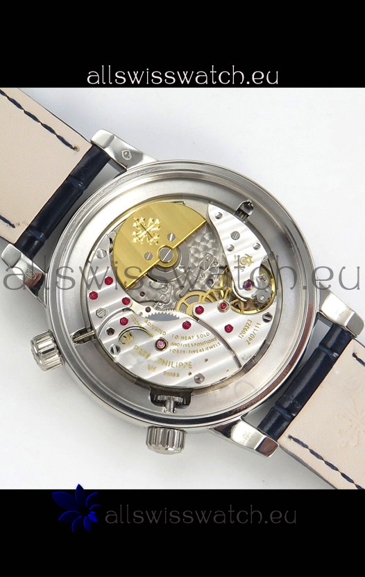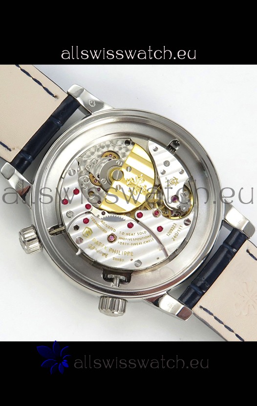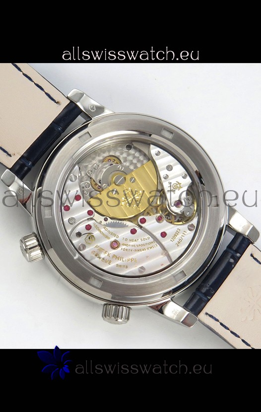 Genuine Swiss 9015 Movement assembled to Resemble the Authentic Patek Philippe PP 240 Calibre Style Movement. Updated Rotor, Bridged and Engravings on Movement with Rose Gold Plated Patek Philippe Stamped Rotor