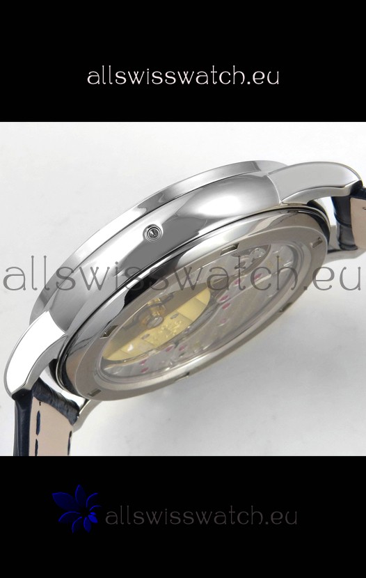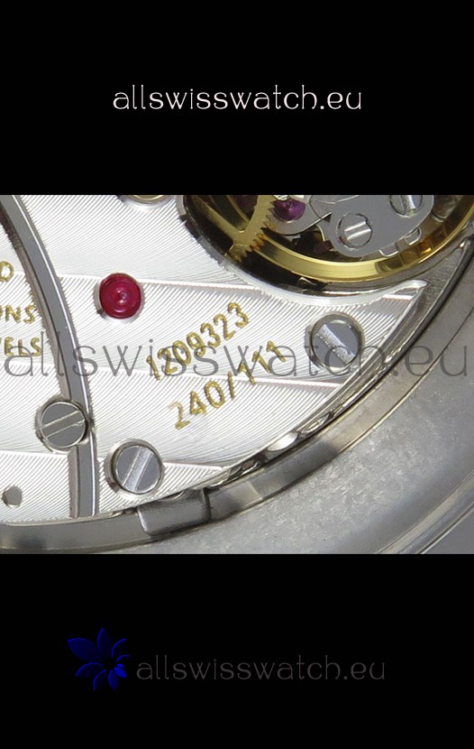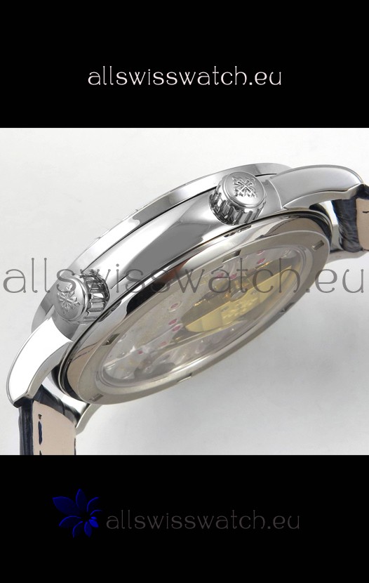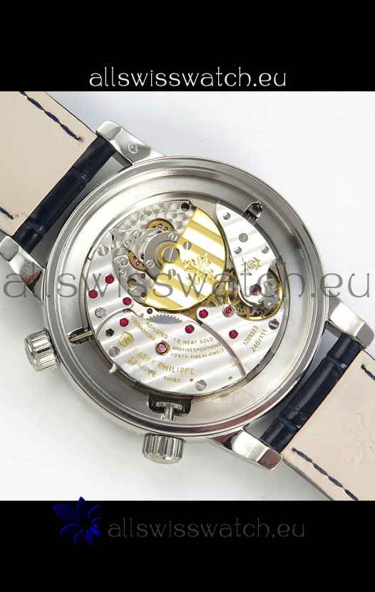 Genuine Swiss 9015 Movement assembled to Resemble the Authentic Patek Philippe PP 240 Calibre Style Movement. Updated Rotor, Bridged and Engravings on Movement with Rose Gold Plated Patek Philippe Stamped Rotor