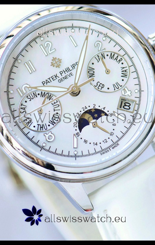 White Mother of Pearl Dial with Day/Month and Moonphase Indicators (Moonphase functions as Day and Night Function)