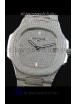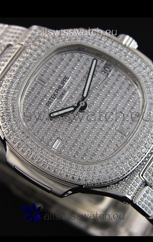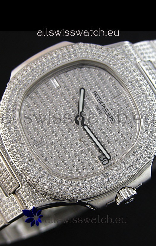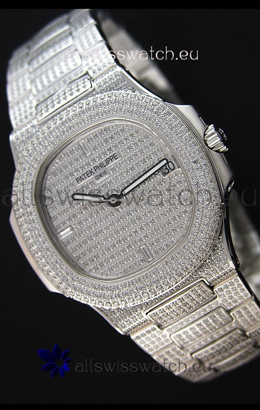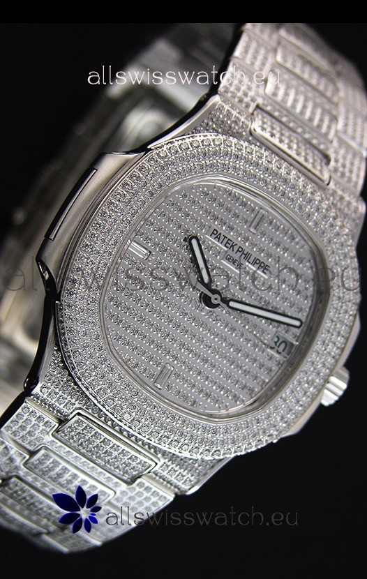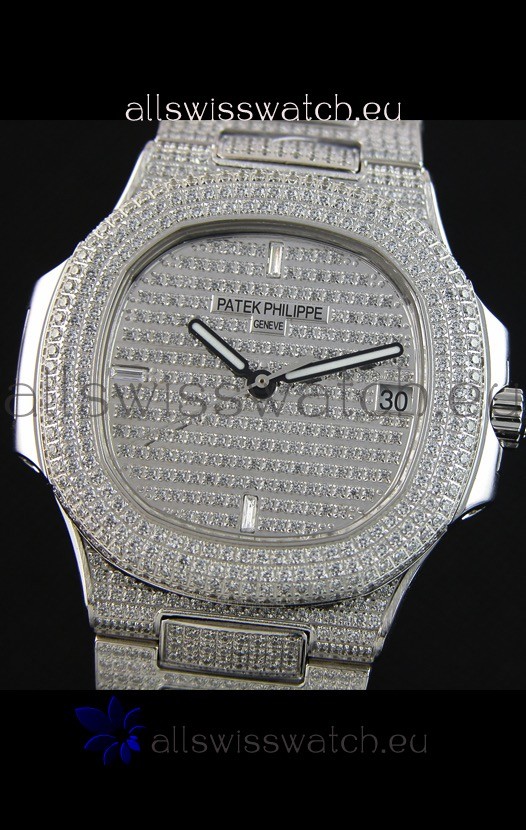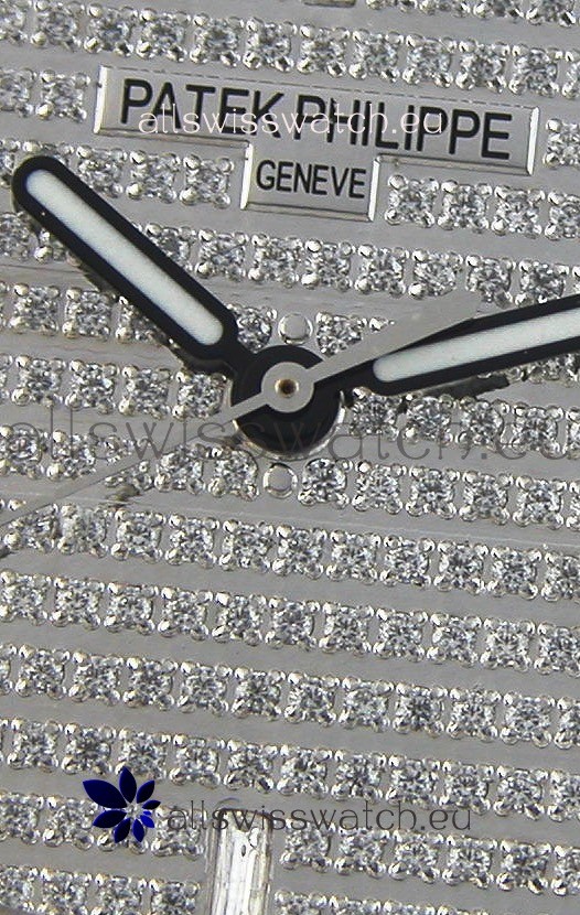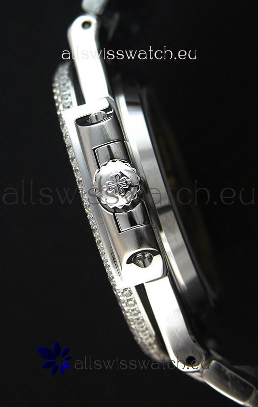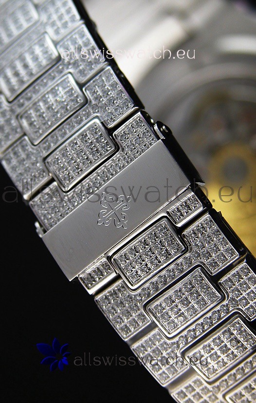 Diamonds Encrusting on 316L Solid Stainless Steel Strap linked with Screws with Folding Patek Philippe Clasp.