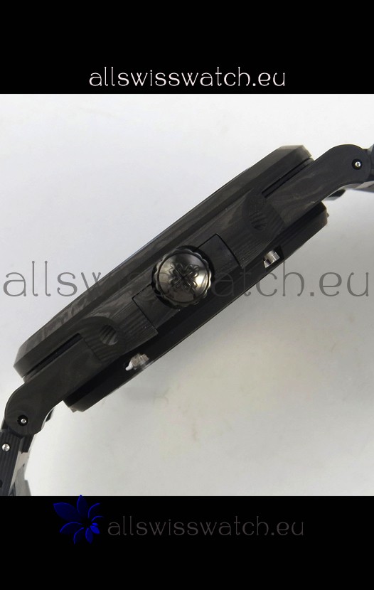 Forged Carbon Fiber Strap linked with Pins as per the originals with Signature Patek Philippe Clasps as per the originals.