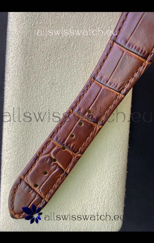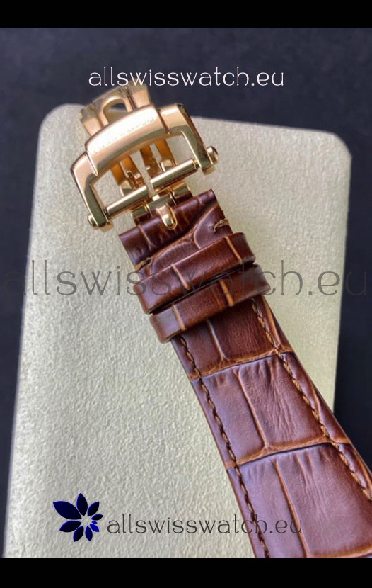 Genuine Leather Strap in Brown with Double Fold Rose Gold Plated Stainless Steel Clasps with Patek Philippe Markings/Engravings