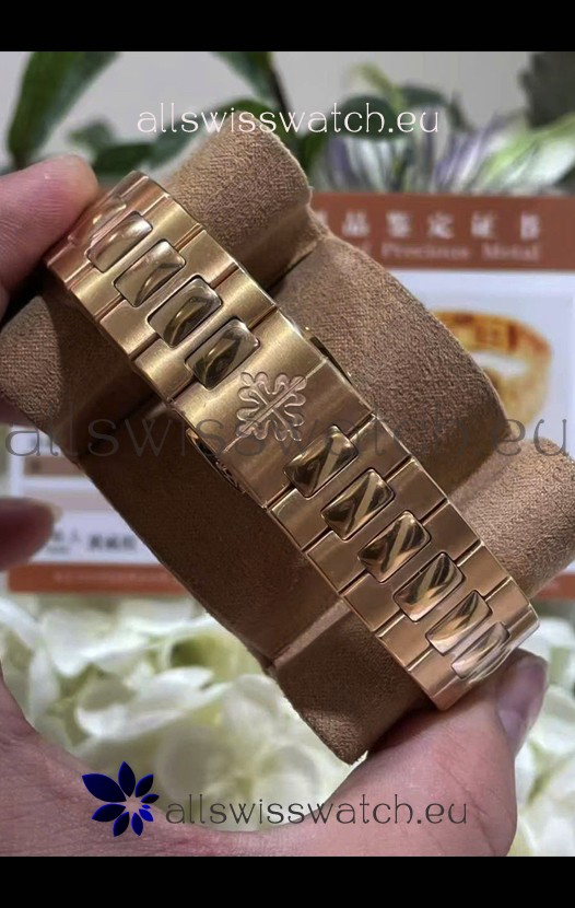 18K Rose Gold Plating on 904L Stainless Steel Strap linked with Screws with Double Fold Stainlless Steel Clasps with Patek Philippe Markings/Engravings