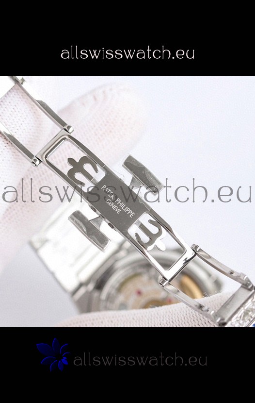 Diamonds Paved 904L Stainless Steel Strap with Steel Folding Clasp complete with Patek Philippe Markings.