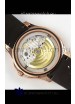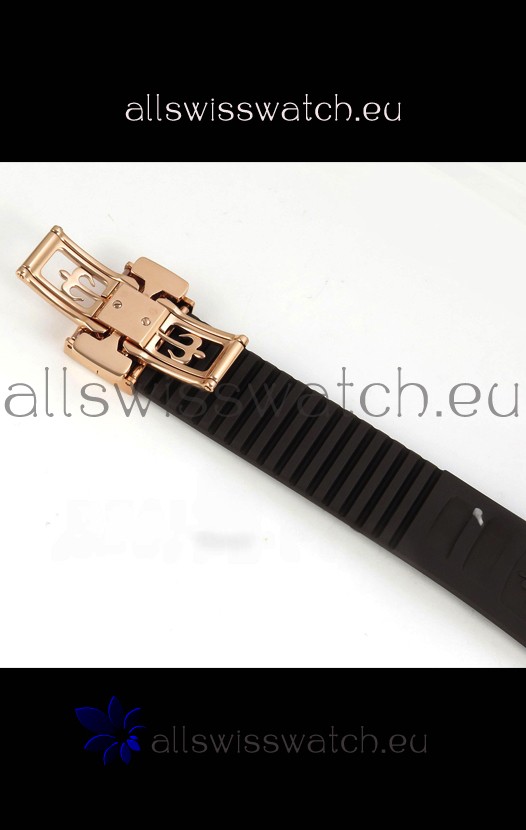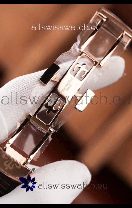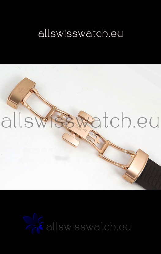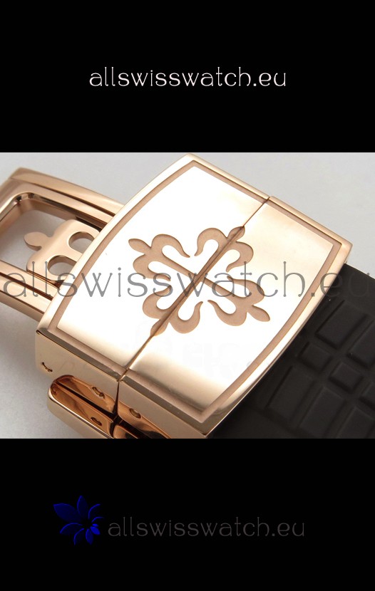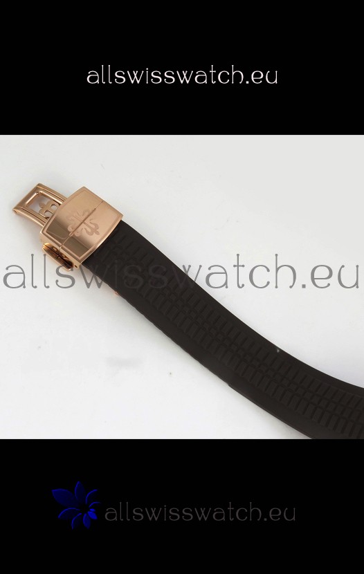 Brown Curved Rubber Strap with Rose Gold Plating on Steel Folding Clasp complete with Patek Philippe Markings. A Highly Updated Clasps for this series with much more accurate markings/engravings.