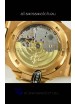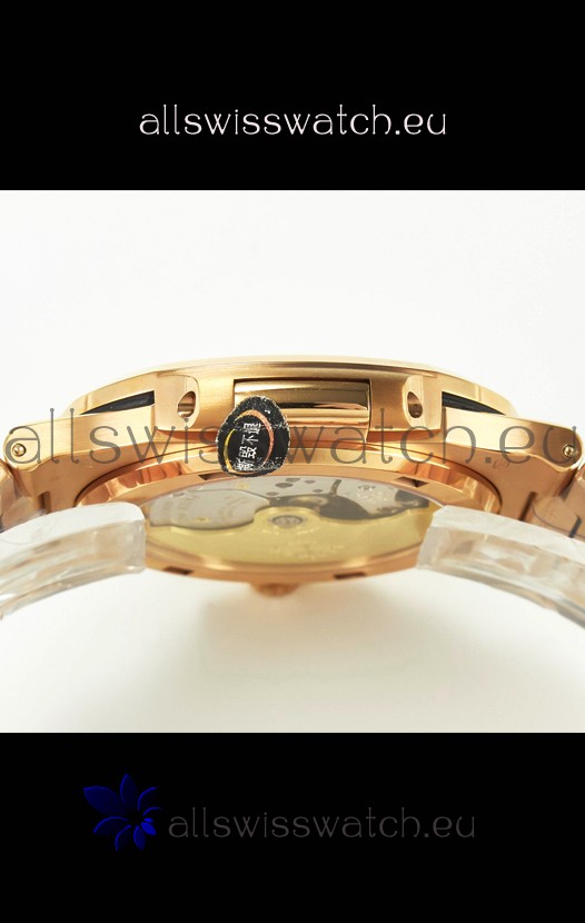 18K Rose Gold Plating on 904L Solid Stainless Steel Case with Open Case Back Cover in Steel. Polished Bezel Borders