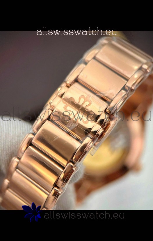 18K Rose Gold Plating on 904L Stainless Steel Polished Strap with Steel Folding Clasp complete with Patek Philippe Markings.
