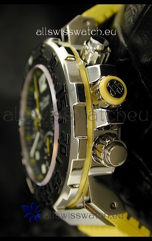 Function: Hour, Minute, Second, Date Windows at 4:30 O'Clock and Fucntional Stopwatch Feature exactly like the Authentic with Three Functional Sub Dials