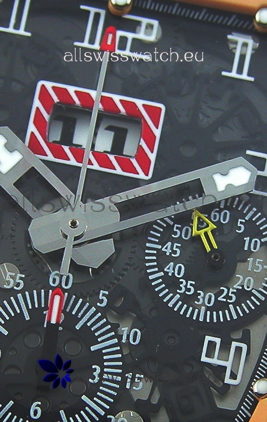 Skeleton Dial with date Window between 4-5 O'Clock. Pink Gold Plated Stem and Pusher Buttons