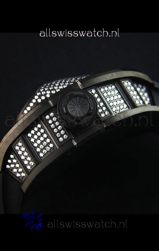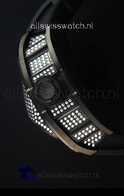 Thick PVD Coated Casing encrusted with Lab Created Diamonds on Dial and Case Sides.