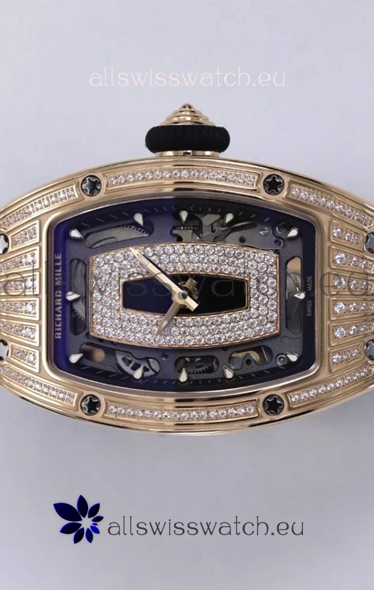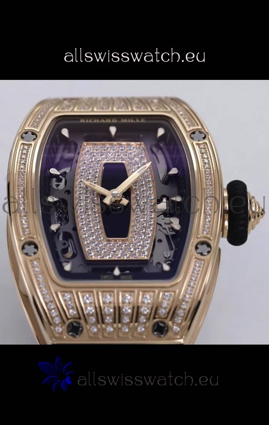 You're reviewing: Richard Mille Super Clone RM07-01 Diamonds Paved 904L Rose Gold Casing Automatic Replica Watch