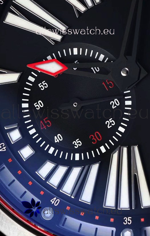 Black Dial with Roman Hour Numerals and Date Window at 6 O'Clock. Functional Sub Dial for Seconds hands at 9 O'Clock