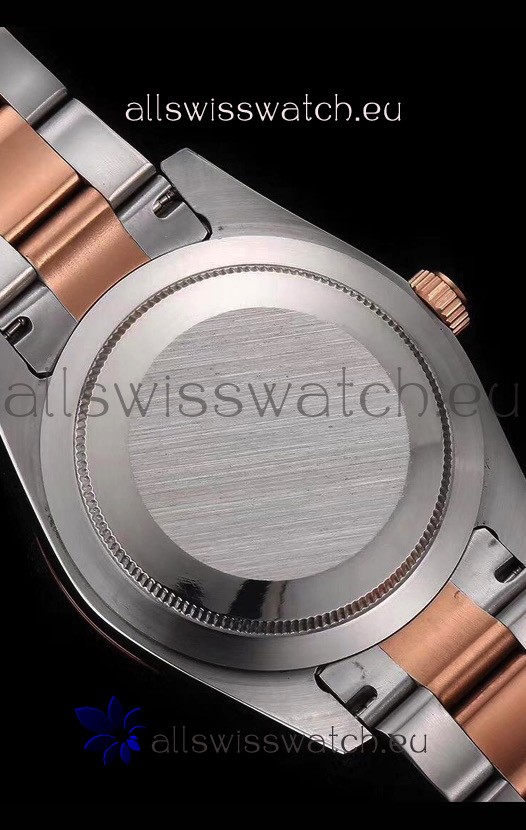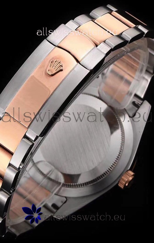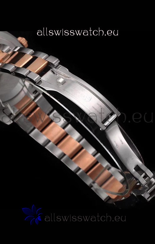 Rose Gold Plating on 904L Stainless Steel strap with Folding Clasp, End links match up Flush with the Case. Oyster Caseback with Anti-Magnetic Shield inside of Case.