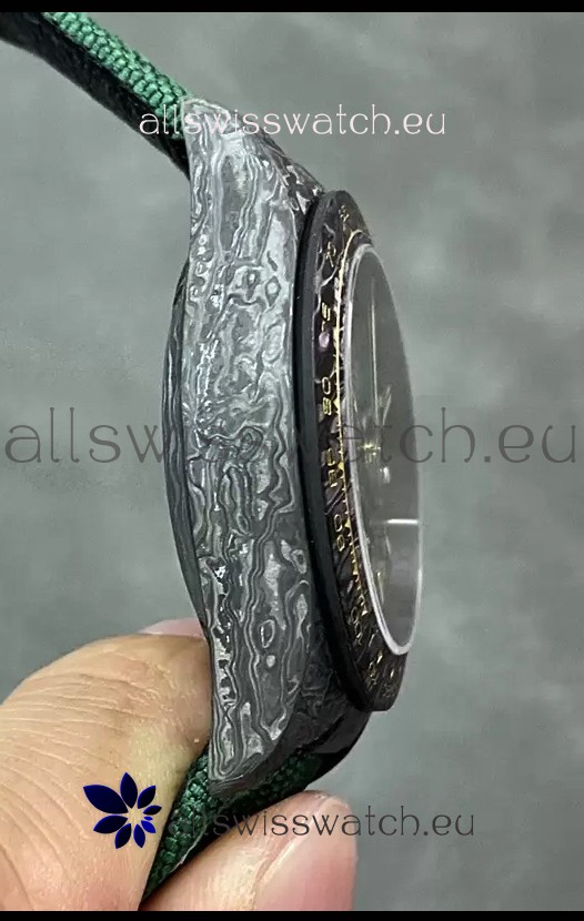 One Piece Lightweight Solid Forged Carbon Casing with Natural Patterns. No Two watches would be alike.