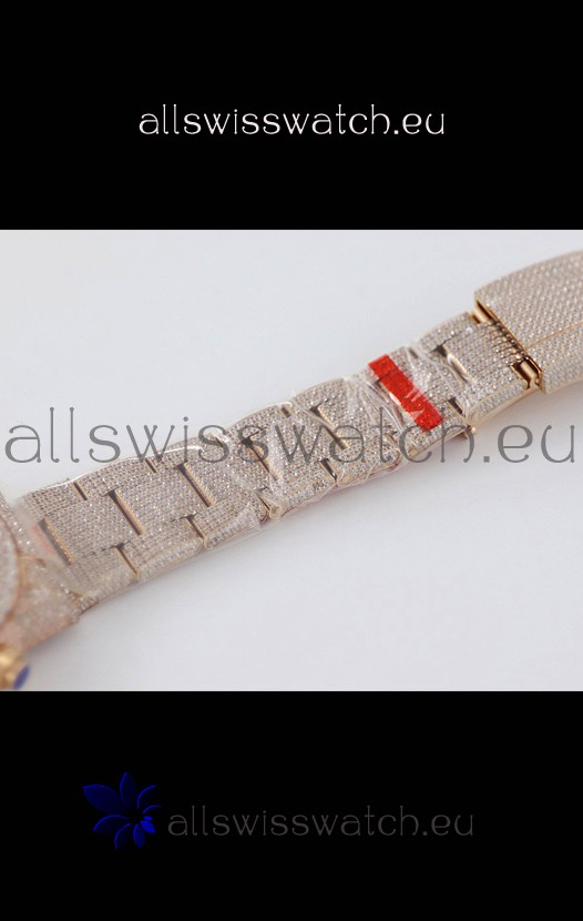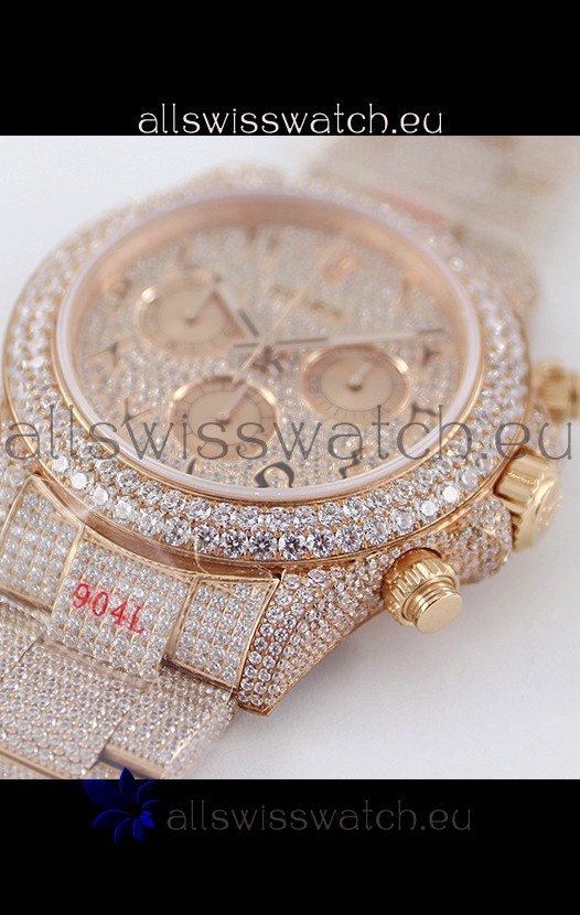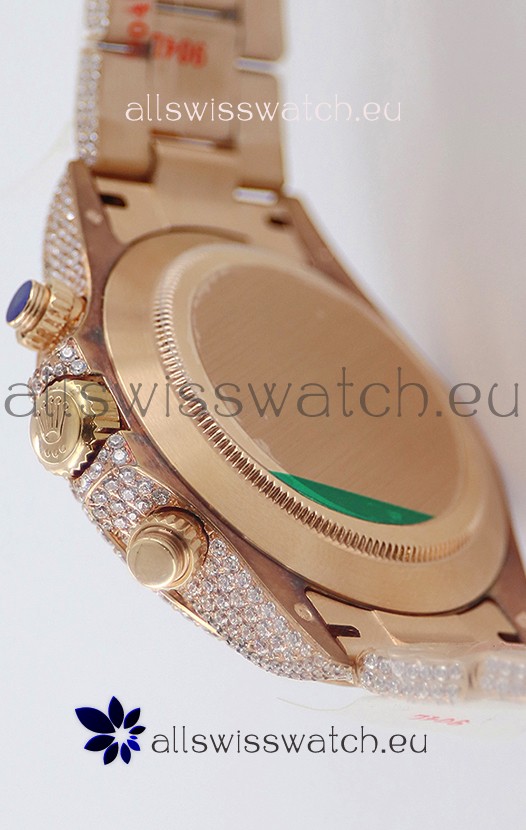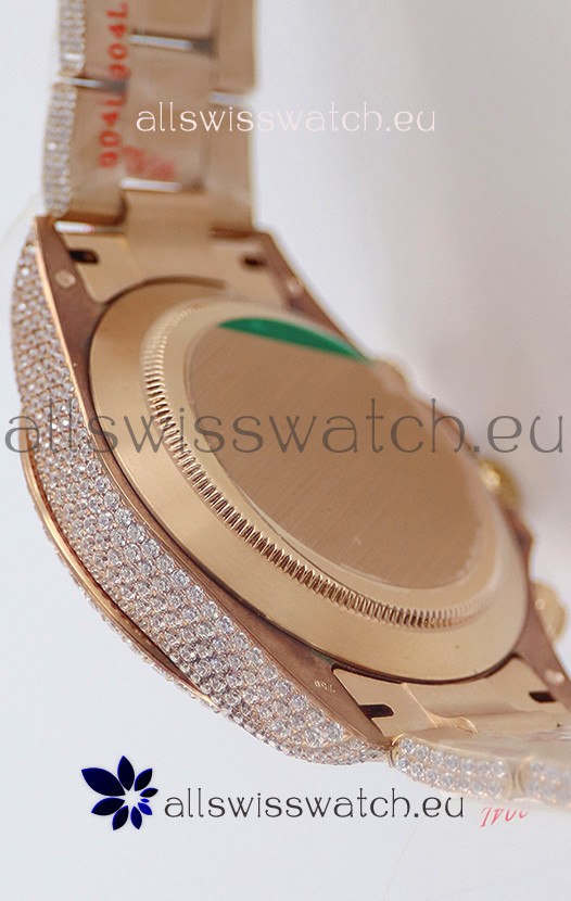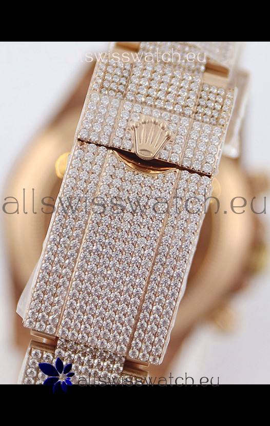 Diamonds Paved Casing on 18K Rose Gold Plating on 904 Solid Stainless Case with Rolex Markings and Engravings like the Authentic.