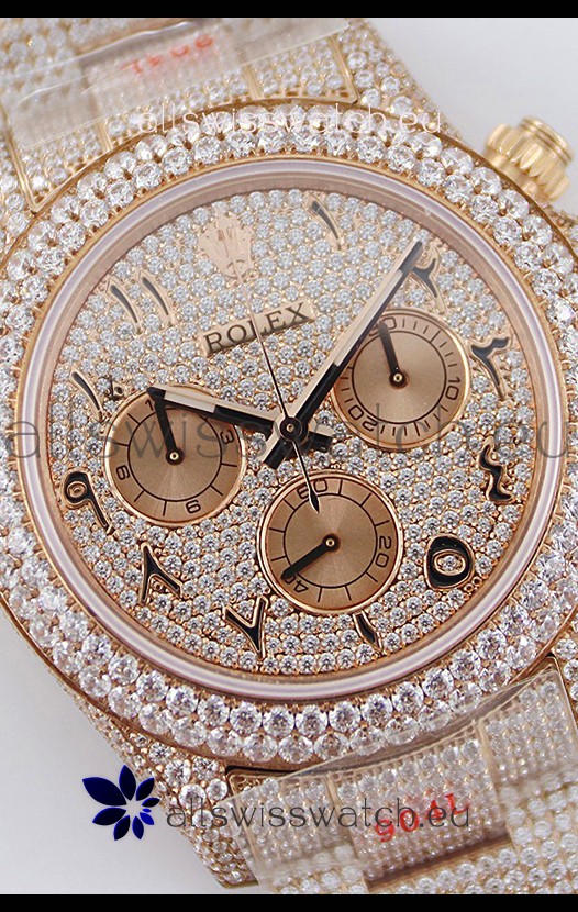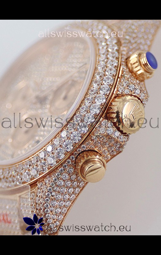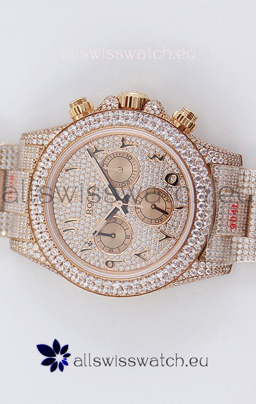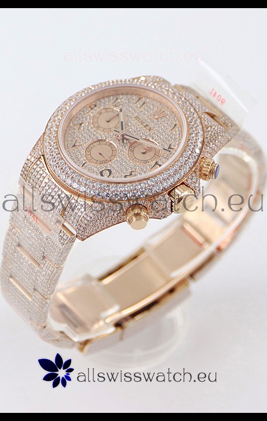 You're reviewing: Rolex Cosmograph Daytona Rose Gold ICED OUT Cal.4130 Movement - 904L Steel Watch