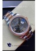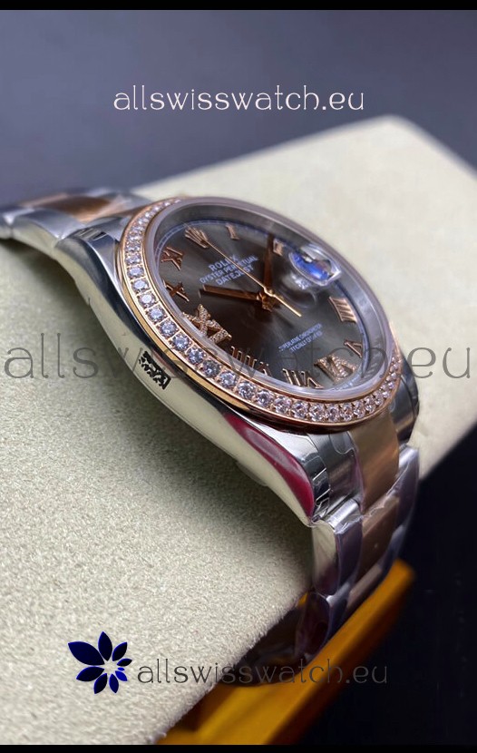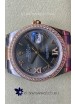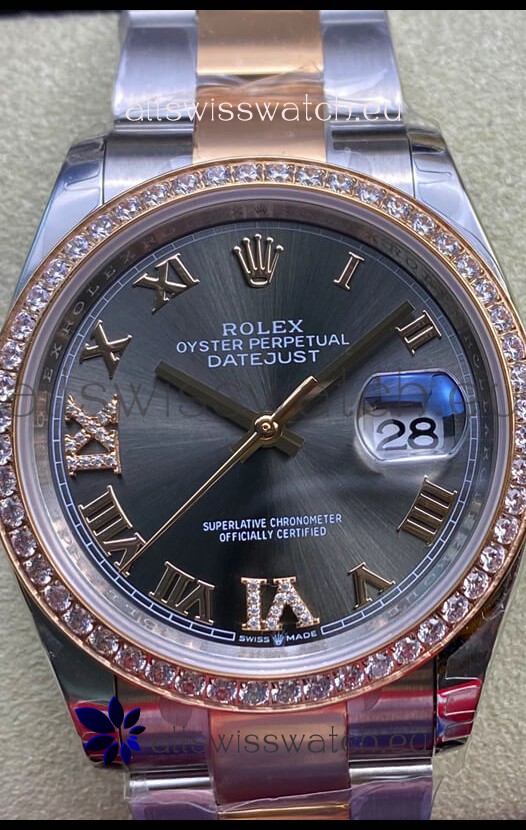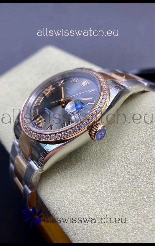 Steel Grey Dial with Rose Gold Roman Hour Numerals. Swiss Cut Diamonds Bezel