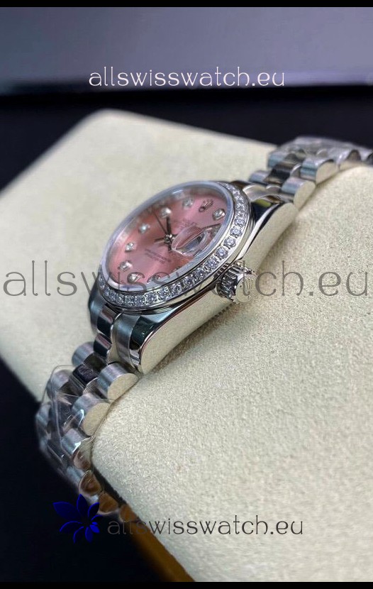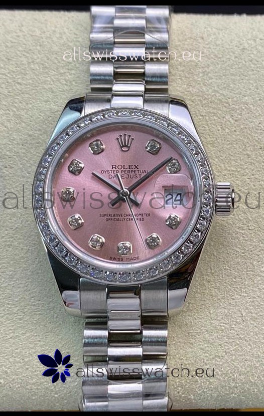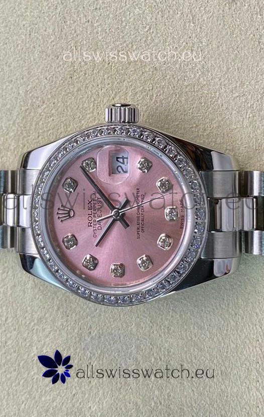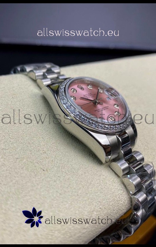 Pink Dial with Diamonds Hour Markers. Swiss Cut Diamonds Bezel