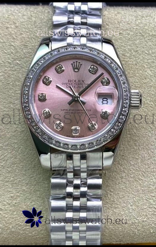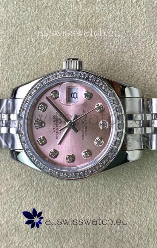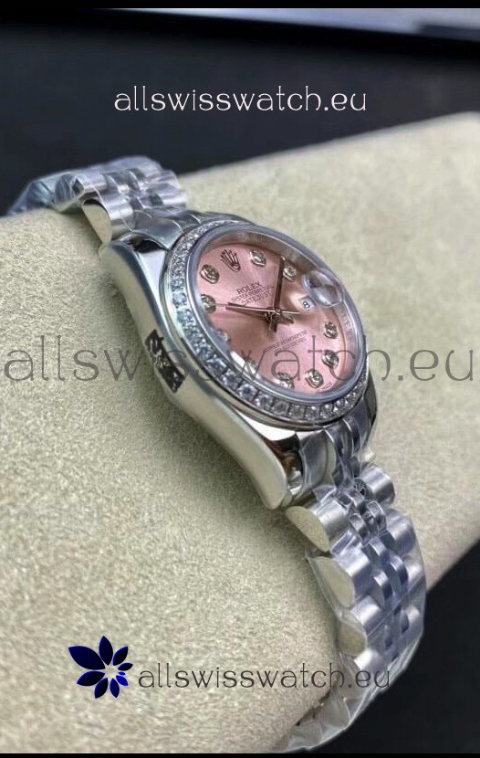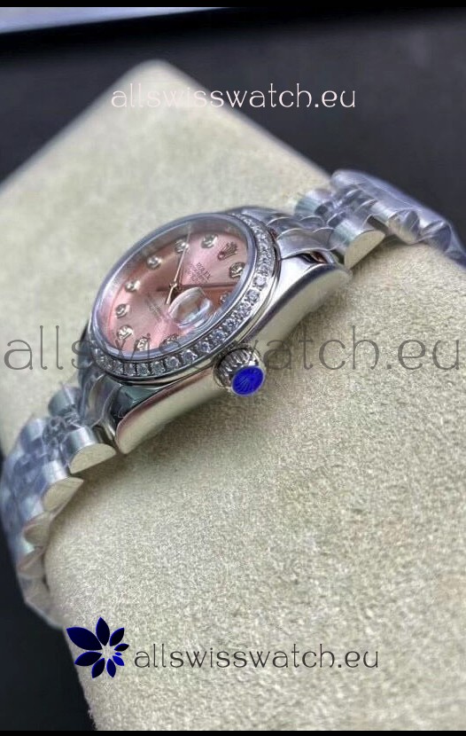 Pink Dial with Diamonds Hour Markers. Swiss Cut Diamonds Bezel