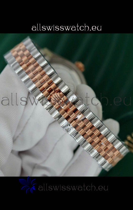 18K Rose Gold Plating on 904L Stainless Steel Two Tone Strap with New Style Rolesor Deployant Buckle, End links match up Flush with the Case. - A Much Improved Datejust Strap Version