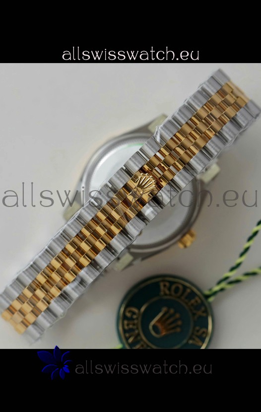 18K Yellow Gold Plating on 904L Stainless Steel Two Tone Strap with New Style Rolesor Deployant Buckle, End links match up Flush with the Case. - A Much Improved Datejust Strap Version