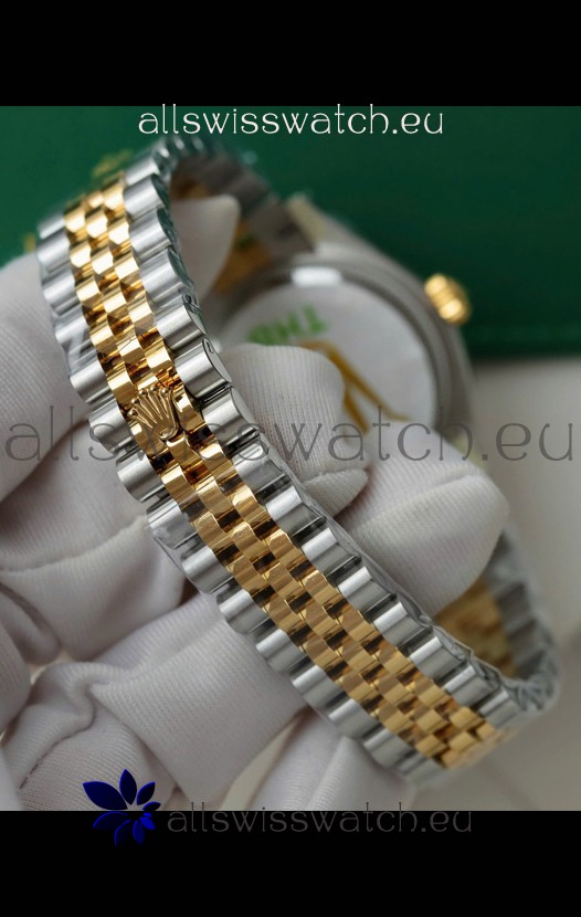 18K Yellow Gold Plating on 904L Stainless Steel Two Tone Strap with New Style Rolesor Deployant Buckle, End links match up Flush with the Case. - A Much Improved Datejust Strap Version