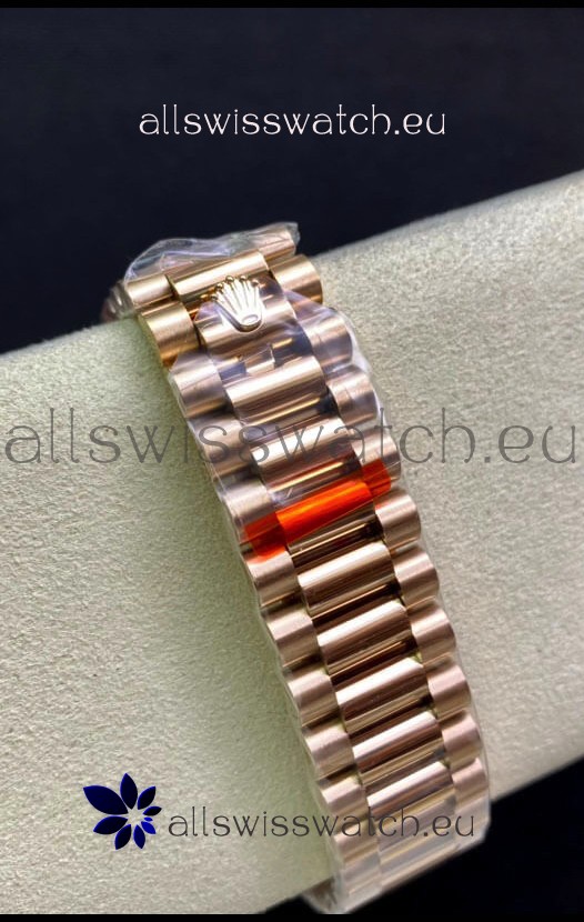 18K Rose Gold Plating on 904L Stainless Steel New Design President Strap with Folding Clasps complete with Rolex Markings and Engravings