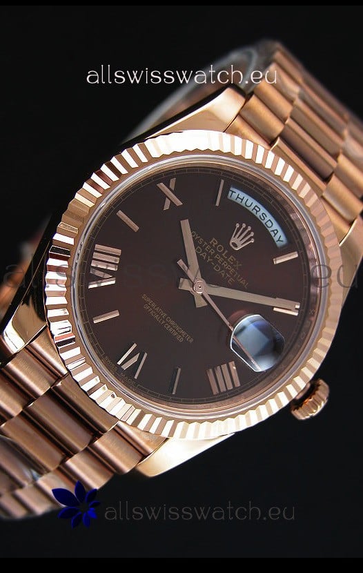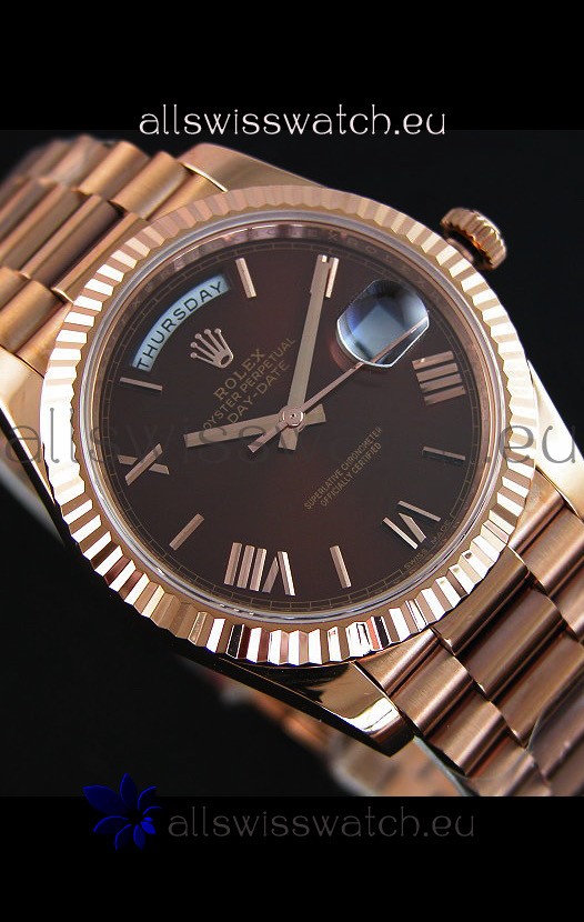 You're reviewing: Rolex Day Date Japanese Replica Watch - Rose Gold Casing in Maroon Dial 40MM