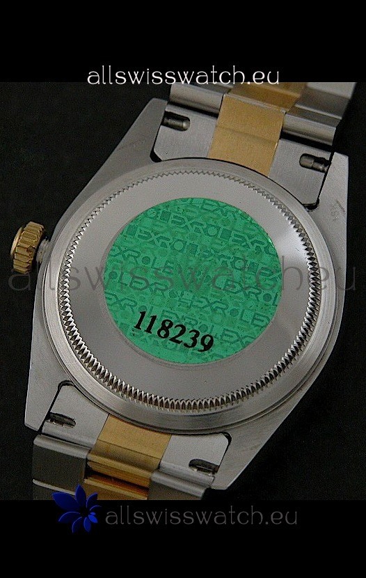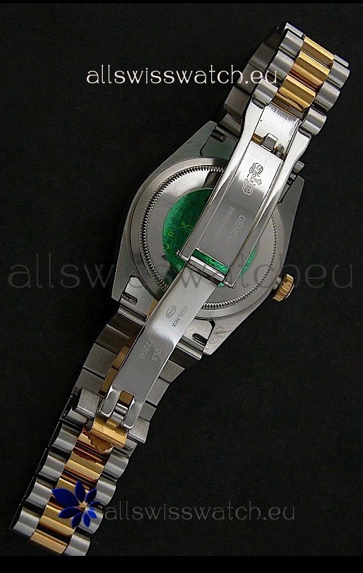Other Feartures: Yellow Gold Thick Plated on Steel Fluted Bezel, Green Hologram Sticker behind the Watch and Scratch Proof Sapphire Crystal with Double Layer Anti Reflective Coating