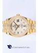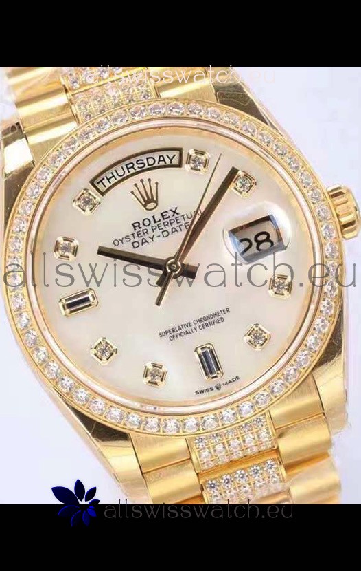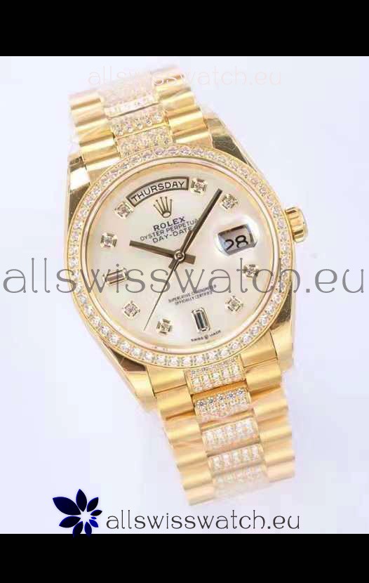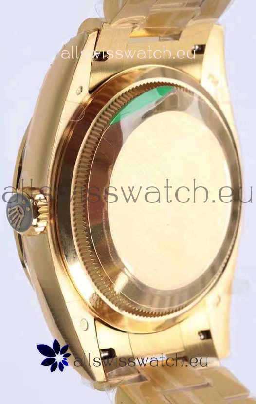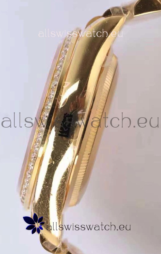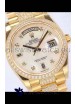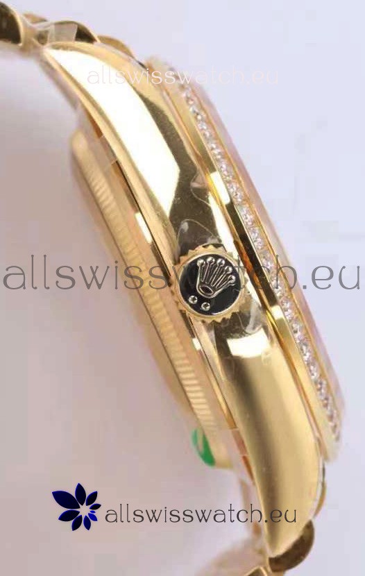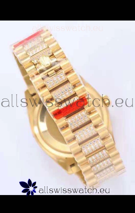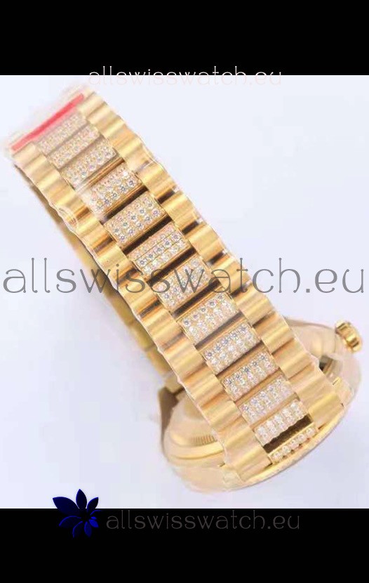 18K Yellow Gold Plating on 904L Stainless Steel New Design President Strap encrusted with Swiss Cut Diamonds with Folding Clasps complete with Rolex Markings and Engravings